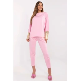 Táto elegantná a zároveň ležérna dámska súprava je dokonalou kombináciou pohodlia a štýlu. Je vyrobená z mäkkej a elastickej zmesi viskózy a elastanu a poskytuje celodenné pohodlie. Mikina s dlhými rukávmi a lodičkovým výstrihom jemne zvýrazňuje výstrih, zatiaľ čo zlaté lemovanie na rukávoch dodáva nádych elegancie. Nohavice s vysokým pásom, sťahovacou šnúrkou v páse a bočnými vreckami zaručujú pohodlie a skvele padnú. Nohavice s lemovaním na spodnom okraji dodávajú športový nádych. Vďaka jednoduchému vzoru a starostlivému spracovaniu je súprava ideálna na každodenný život aj do práce a vytvára štýlový a pohodlný outfit.
