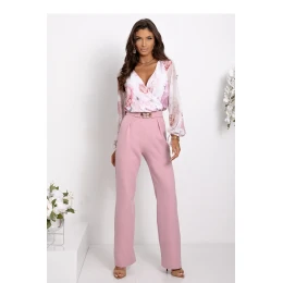 Elegantný a ženský komplet, ktorý zaujme jemnou kombináciou farieb a vzorov. Vzdušný top s výstrihom v tvare presýpacích hodín, zdobený rozmazaným kvetinovým motívom, dodáva ľahkosť a romantiku. Jeho jemný tvar sa nádherne kombinuje s jednofarebnými nohavicami s elastickým pásom v odtieni špinavej ružovej, ktoré zvýrazňujú postavu a zaručujú pohodlie. Štýl je doplnený opaskom s ozdobnou sponou, ktorý jemne zvýrazňuje pás. Je to skvelá voľba na každodenné nosenie aj na výnimočné príležitosti, spájajúca klasiku s moderným šarmom.