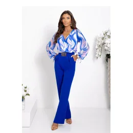 Štýlový a ženský komplet, ktorý spája eleganciu s pohodlím. Blúzka s pestrofarebným vzorom (modrá, ružová, biela) priťahuje pozornosť a dodáva outfitu energiu. Hlboký výstrih krásne zvýrazňuje krk a dekolt, zatiaľ čo voľnejší strih zaručuje pohodlie pri nosení. Nohavice v jednofarebnej modrej farbe dokonale dopĺňajú celkový vzhľad, majú elastický pás pre ešte lepšie prispôsobenie a štýlový opasok s ozdobnou sponou, ktorý zvýrazňuje pás. Ide o skvelú voľbu na každý deň aj na výnimočné príležitosti, ktorá spája módny dizajn s pohodlím.