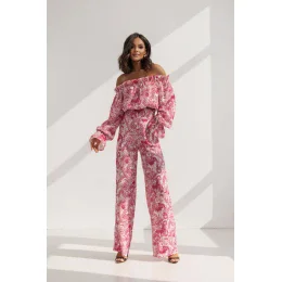 Elegantná a ženská dámska súprava, ktorá spája klasiku s jemnými detailmi. Blúzka s dlhými rukávmi zakončená volánom dodáva ľahkosť a romantiku a výstrih so španielskym výstrihom krásne zvýrazňuje ramená a dekolt, čím dodáva celému oblečeniu zmyselný charakter. Nohavice s vysokým pásom zvýrazňujú pás a predlžujú nohy, zapínajú sa na bokoch na skrytý zips, čo dodáva moderný nádych. Na bokoch sú praktické vrecká, ktoré spájajú funkčnosť s elegantným vzhľadom. Ide o ideálnu súpravu na špeciálne príležitosti, ktorá spája pohodlie s moderným dizajnom.