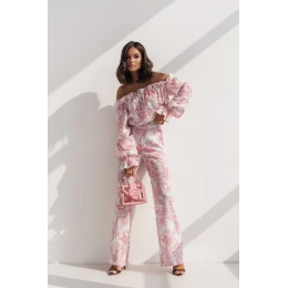 Elegantná a ženská dámska súprava, ktorá spája klasiku s jemnými detailmi. Blúzka s dlhými rukávmi zakončená volánom dodáva ľahkosť a romantiku a výstrih v španielskom štýle krásne zvýrazňuje ramená a dekolt, čím dodáva oblečeniu zmyselný charakter. Nohavice s vysokým pásom zvýrazňujú pás a predlžujú nohy, zapínajú sa na bokoch na skrytý zips, čo im dodáva moderný nádych. Na bokoch sú praktické vrecká, ktoré spájajú funkčnosť s elegantným vzhľadom. Je to dokonalá súprava na špeciálne udalosti, ktorá spája pohodlie s moderným dizajnom.