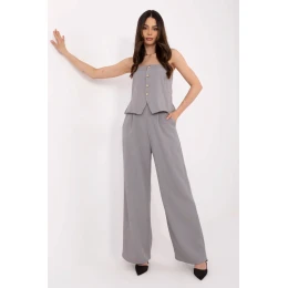 Stylový dámský komplet skládající se z vesty a kalhot je vynikající volbou pro ženy, které ocení eleganci s nádechem modernosti. Ideální na každý den, do práce, na společenské příležitosti nebo večírky, se hodí všude tam, kde záleží na stylu a pohodlí. Vesta bez rukávů, s španělským výstřihem, je zdobena dekorativními knoflíky vpředu a efektními nařasením na zádech, které dodávají siluetě jemnou lehkost a zdůrazňují ženskou linii. Kalhoty s vysokým pasem a širokými nohavicemi opticky prodlužují nohy a krásně se pohybují v pohybu. Vkládané boční kapsy přidávají funkčnost, aniž by narušily elegantní charakter soupravy. Vyrobený z hladkého materiálu, kombinace polyesteru a elastanu, komplet zaručuje pohodlí a styl po celý den.