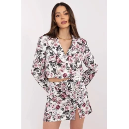 Jedinečný dámský komplet spojující eleganci s dívčím kouzlem, krátká sako a sukňokraťasy s módním květinovým vzorem jsou ideální volbou na každý den, do práce, na návštěvní schůzky nebo večírky. Sako se zkráceným střihem a klopovými límci a dvouřadým zapínáním krásně zdůrazňuje pas, a podšívka zajišťuje pohodlné nošení. Ozdobná, odnímatelná brož dodává celku šik a umožňuje jemné přizpůsobení stylingu k příležitosti. Sukňokraťasy s vysokým pasem kombinují vzhled klasické sukýnky s komfortem kraťasů. Vložena guma na zadní straně pasu zajišťuje dokonalé přizpůsobení a pohodlí po celý den, i během intenzivnějších aktivit. Chybějící kapsy zachovávají hladkou linii siluety. Vyrobený z vysoce kvalitní směsi polyesteru a elastanu se komplet prezentuje lehce a žensky, a zároveň je pohodlný a praktický.