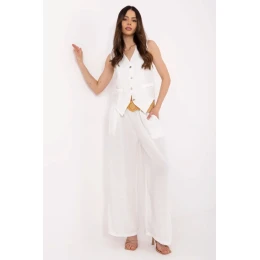 Stylový dámský komplet v casualním provedení, který se skvěle hodí jak na každodenní nošení, tak do práce. Skládá se z přiléhavé vesty a kalhot s širokými nohavicemi, vytvářející módní a pohodlnou součást s jemným, elegantním akcentem. Vesta bez rukávů se zapínáním na knoflíky má klasický výstřih do V, který krásně podtrhuje linii krku. Obohacená o dekorativní vyšívání a pásek na zavázání v pase, skvěle modeluje siluetu a dodává stylizaci originalitu. Kalhoty s vysokým pasem a širokými nohavicemi opticky prodlužují nohy, a vsazené boční kapsy zajišťují praktičnost bez ztráty elegantního vzhledu. Vyrobený z elastického materiálu, kombinace polyesteru a elastanu, komplet zaručuje pohodlí při nošení po celý den, přičemž si zachovává módní, promyšlený vzhled.