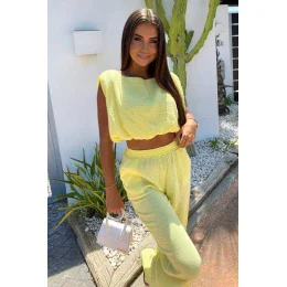 Súprava mušelínu je skvelou kombináciou pohodlia a štýlu. Ľahký top bez rukávov je v spodnej časti zakončený elastickou manžetou, vďaka čomu skvele sedí na postave a poskytuje pohodlie pri nosení. Dlhé nohavice s mäkkým pásom zabezpečujú voľnosť pohybu a vložené vrecká dodávajú praktickosť. Celý kúsok je vyrobený z priedušného mušelínu, ktorý je skvelý na teplé dni a vytvára ženský a prirodzený štýl.