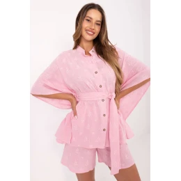 Táto súprava pozostáva z košele a krátkych šortiek a je ideálnym dizajnom na každodenné pohodlné nosenie. Je vyrobená z prírodného, priedušného mušelínového bavlneného materiálu s jemnou výšivkou, ktorá dodáva súprave jemnú eleganciu. Košeľa so zapínaním na gombíky, s pohodlným opaskom na zaväzovanie v páse, má 3/4 rukávy a štýlový stojací golier vo výstrihu, čo jej dodáva ľahkosť a modernosť. Šortky s vysokým pásom a jednoduchým strihom majú praktické bočné vrecká a pohodlný elastický pás, ktorý zaručuje ideálne prispôsobenie. Celkovo ide o pohodlnú a jednoduchú súpravu, ktorá je skvelá na letné dni a každodenné príležitosti.