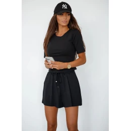 Táto dámska súprava z viskózy s pridaným elastanom je ideálnou kombináciou štýlu a pohodlia. Obsahuje tričko s krátkymi rukávmi a klasickým okrúhlym výstrihom, ktorý jemne zvýrazňuje postavu a zaručuje pohodlné nosenie. Krátke šortky s elastickým pásom a šnúrkou na stiahnutie zaručujú dokonalé prispôsobenie a bočné vrecká dodávajú praktickosť. Vďaka ľahkému, priedušnému materiálu s pridaným elastanom je táto súprava mäkká, pružná a skvelá na každodenné nosenie aj na leňošenie.