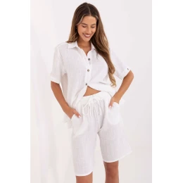 Táto ľahká mušelínová súprava pozostávajúca z košele a šortiek je ideálnou voľbou na teplé každodenné dni. Je vyrobená z na dotyk príjemnej, priedušnej bavlny a poskytuje maximálne pohodlie a voľnosť pohybu. Hladký materiál zdôrazňuje minimalistický, ležérny štýl súpravy. Košeľa s krátkymi rukávmi, golierom a gombíkmi pôsobí elegantne a moderne a prídavný opasok na zaväzovanie umožňuje zvýrazniť pás a dodať postave ženský tvar. Šortky s rovnými nohavicami a vysokým pásom majú praktické bočné vrecká. Súprava je ideálna na každodenné nosenie na prechádzku, nákupy alebo stretnutie s priateľmi.