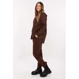 Elegantní a pohodlný dámský set v casual stylu, ideální na každý den. Vyrobený z vysoce kvalitní směsi viskózy a elastanu, je elastický, prodyšný a mimořádně příjemný na dotek, což zajišťuje maximální pohodlí při nošení. Součástí setu je mikina s kapucí a kalhoty s dlouhými, sevřenými nohavicemi. Mikina se vyznačuje ozdobnou aplikací z jehlic a krajkovými vložkami na zádech, zadní části rukávů a dole na přední straně, což dodává celku jemnou eleganci. Kalhoty mají vsazený elasický pás a boční kapsy, díky čemuž jsou jak pohodlné, tak praktické. Jedná se o skvělý set pro ženy, které ocení kombinaci pohodlí, ženskosti a módních detailů, ideální pro každodenní stylizace, procházky nebo setkání s přáteli.