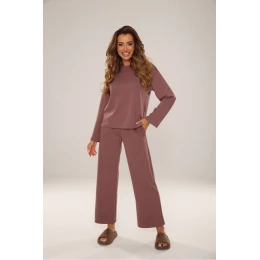 Dámský homewear set v barvě mocca je harmonickou kombinací pohodlí a jemné elegance. Vytvořený s ohledem na relaxaci v domácím prostředí, poskytuje maximální pohodlí při nošení a příjemné zahřátí po celý den. Vyrobena z mimořádně měkkého úpletu typu "masełko", vyniká dokonale hladkou strukturou a jemným, noblesním leskem, který dodává každodenním outfitům nádech luxusu. Mikina s volným střihem s dlouhým rukávem a polokruhovým výstřihem. Dlouhé kalhoty s praktickými kapsami, elastickým pásem umístěným v tunelu pro dokonalé přizpůsobení. Skvělá volba pro odpočinek doma, pro procházky a pro každodenní outfit. Tento set je esencí pohodlného homewearu – měkký, stylový a neuvěřitelně pohodlný, takže si ho budete rádi nosit celý den.