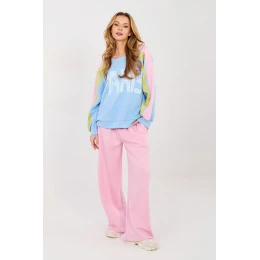 Moderná dámska džersejová súprava pozostávajúca z mikiny a nohavíc, ktorá sa drží ležérneho štýlu a je ideálna na každý deň. Skvele sa hodí na každodenné aktivity, na prechádzku alebo na relax v domácom úkryte. Je vyrobená z kvalitnej zmesi polyesteru, viskózy a elastanu, ktorá poskytuje pohodlie, pružnosť a dobre prilieha k postave. Mikina s dlhými rukávmi a klasickým okrúhlym výstrihom bola na prednej strane ozdobená nápisom, ktorý celku dodáva moderný charakter. Nohavice s dlhými širokými nohavicami a vysokým pásom zaručujú pohodlie pri nosení a bočné vrecká zvyšujú funkčnosť. Pruhy na rukávoch mikiny sú štýlovým prvkom zdôrazňujúcim športovo-urbánny vzhľad.