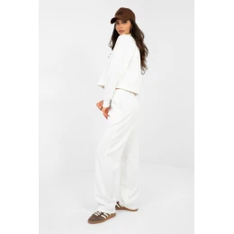 Kompletný teplý oblek pozostávajúci z mikiny a nohavíc je pohodlnou voľbou na každodenný ležérny štýl. Mikina je kratšia ako štandard s dlhými rukávmi a golierom, ktorý celku dodáva moderný charakter, a vyšívaný nápis na prednej strane je módnym ozdobným prvkom. Nohavice s dlhými rovnými nohavicami a vysokým pásom zabezpečujú pohodlie a voľnosť pohybu. V páse je šnúrka na individuálne prispôsobenie a bočné vrecká zvyšujú funkčnosť modelu. Oblek je vyrobený z kombinácie polyesteru, elastanu a viskózy, vďaka čomu je mäkký, pružný a príjemný na nosenie. Ideálna voľba na každý deň, na oddych doma aj na bežné výlety.