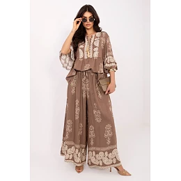 Dámský komplet v boho stylu je lehký a stylový návrh ideální na každodenní nošení. Volný střih a módní potisk dodávají celku unikátní, umělecký charakter, který skvěle zapadá do uvolněných ženských stylizací. Souprava se skládá z blůzy a kalhot vyrobených z kombinace viskózy a polyamidu, co zaručuje prodyšnost, lehkost a pohodlí nošení. Blůza s 3/4 rukávem má kulatý výstřih s vázáním, který dodává jemnou eleganci a umožňuje jemné nastavení. Kalhoty s dlouhými nohavicemi byly navrženy s ohledem na pohodlí, mají stahovací šněrování v pase, které umožňuje ideální přizpůsobení postavě. Volný střih zajišťuje volnost pohybu a celkově vytváří harmonickou, stylovou kombinaci na každý den. Je to skvělá volba pro ženy, které oceňují pohodlí, přírodní materiály a neokázalý, boho styl.