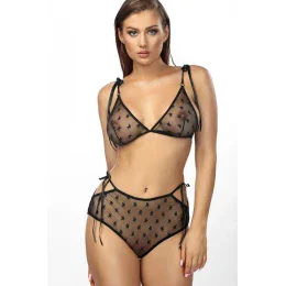 Priehľadná súprava sladko zviazaná na bokoch, vyrobená z jemného elastického tylu. Súprava obsahuje krásnu podprsenku a vysoké nohavičky. Tkanina v sladkých hviezdičkách - jemná, ako zvodný, zmyselný závoj... Ramienka sladko uviazané.