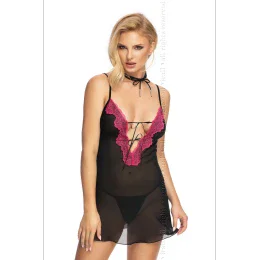 Čierna, zmyselne priehľadná nočná košieľka s hlbokým, zvodným výstrihom. Bohato zdobené ružovou jemnou čipkou, s dvoma ozdobnými stuhami, ktoré môžete zviazať do mašle. Pokračujte! Oblečte si tento odev a sladko provokujte Jeho pohľad! Tangá sú súčasťou balenia. Ps. Ozdoba na krk nie je súčasťou dodávky.