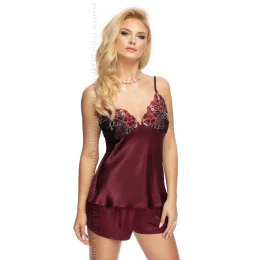 Exkluzívna saténová súprava nočnej bielizne z talianskeho saténu v krásnej slivkovej farbe. Dvojdielne, veľmi mäkké a pohodlné. Tkanina má jemný, ušľachtilý lesk. Profilované košíčky zdobené vyšívaným tylom. Nastaviteľné popruhy. Šortky na gumičku.