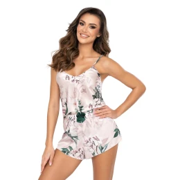 Pyžamová súprava NELLY 1/2, vytvorená s ohľadom na horúce noci, je vyrobená z hodvábneho saténu a poskytuje telu oddych aj v tých najteplejších chvíľach. Košieľka je zavesená na tenkých ramienkach, s hlboko vykrojeným výstrihom, v páse siahajúcom až k zadku. Krátke šortky, s nohavičkami jemne zdvihnutými na bokoch, dosahujú dĺžku za zadok. Súprava v striebristo ružovom odtieni, dômyselne zdobená kvetinovými motívmi. Vyrobené v Poľsku.