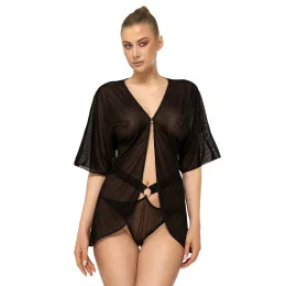 Vzdušná čierna nočná košeľa typu negližé, pohodlne zapínaná vpredu. Hladké. Mäkký, jemný a zmyselný tyl, ktorý okamžite rozmaznáva telo a láka priehľadnými detailmi. Späť s veľkolepým rozdelením.