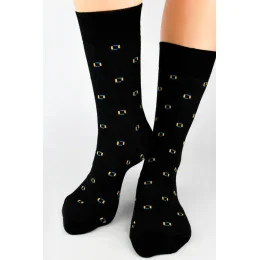 Skarpetki męskie wzorzyste, wykonane z wysokij klasy bawełny, przyjemnej w dotyku. Posiadają nieuciskowy ściągacz oraz płaski szew.