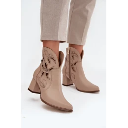 Skórzane Ażurowe Botki Damskie Na Słupku Zazoo 3647 Jasnobeżowe