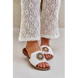 Skórzane Klapki Z Ozdobą Na Płaskim Obcasie Lewski 3047/O Białe