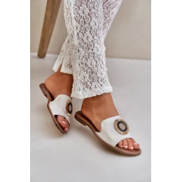 Skórzane Klapki Z Ozdobą Na Płaskim Obcasie Lewski 3047/O Złoty Przecierany