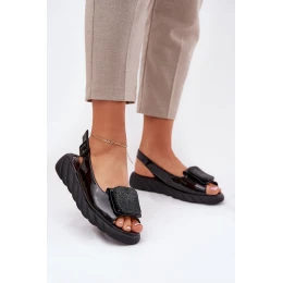 Skórzane Lakierowane Sandały Damskie Na Koturnie z Ozdobą Artiker 56C1564 Czarne