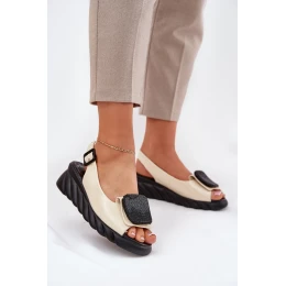 Skórzane Lakierowane Sandały Damskie Na Koturnie z Ozdobą Artiker 56C1567 Beżowe