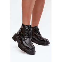 Skórzane Ocieplane Botki Damskie Z Ozdobami Lakierowane Artiker 57C0345 Czarne