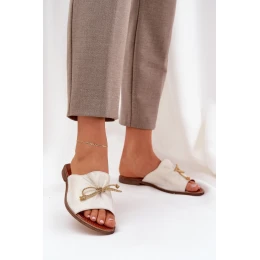 Skórzane Płaskie Eleganckie Klapki Z Kokardką Lewski 3572 Złoty Przecierany