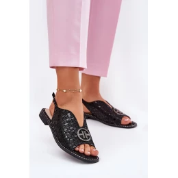 Skórzane Sandały Na Płaskim Obcasie Z Ozdobą S.Barski KV51-094 Czarne