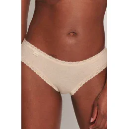 Dámske bavlnené bikiny z radu WEEKEND. Strih Hipós pohodlnými, širokými bokmi.Elastické pásiky a výrez na nohaviciach s jemným plochým krajkovým lemom.Malé logo sloggi v páse.Zloženie: 95% bavlna, 5% elastan.