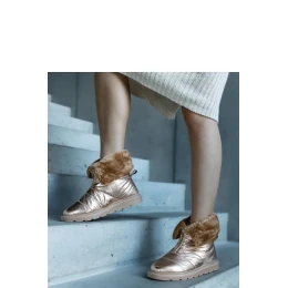 Zateplené snehule Edidda so zlatým golierom sú ideálnou obuvou na zimu. Ich okrúhla špička poskytuje pohodlie a voľnosť pohybu, zatiaľ čo vysoký zvršok zaručuje teplo aj počas najchladnejších dní. Vďaka módnemu dizajnu sú ideálne do mesta aj na lyžovačku. Gumová platforma zároveň zaručuje stabilitu a pohodlie pri chôdzi. Táto obuv spája štýl s funkčnosťou a je ideálna pre ženy, ktoré si cenia pohodlie a módny vzhľad. K dispozícii v zlatej farbe, so zapínaním na zips. Ideálne na jeseň a zimu.