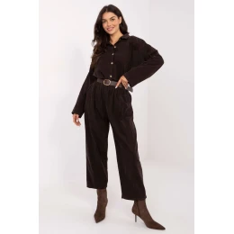 Pohodlné a štýlové dámske nohavice s voľným strihom, ktoré sú ideálne na každý deň. Sú vyrobené z mäkkého polyesteru, poskytujú pohodlie pri nosení a voľnosť pohybu. Model má vysoký pás so všitou gumou, vďaka čomu skvele sedí a zvýrazňuje pás. Nohavice majú bočné vrecká a otvorené vrecká v zadnej časti, čo im dodáva praktickosť. Celý vzhľad dopĺňa zapínanie na opasok v páse, ktoré je módnym a funkčným detailom. Hladký materiál a široké nohavice im dodávajú ľahkosť a nonšalantnosť, sú ideálne na ležérne a každodenné oblečenie, či už s elegantnou košeľou alebo voľným tričkom.