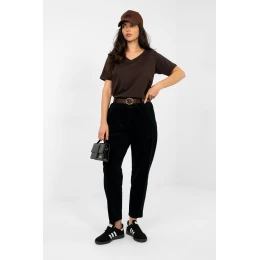 Tieto džínsové nohavice s mrkvovou potlačou sú pohodlnou a štýlovou ponukou na každodenné nosenie aj pracovný styling v uvoľnenom, ležérnom dizajne. Sú vyrobené z kombinácie bavlny s prídavkom elastanu, vďaka čomu poskytujú pohodlie pri nosení, pružnosť a dobre sa prispôsobujú postave. Hladký vzor a zúžené nohavice s dĺžkou 7/8 dodávajú celému kúsku moderný charakter. Model s vysokým pásom a elastickým pásom zaručuje pohodlie počas celého dňa a je vybavený aj opaskom na zaväzovanie, ktorý zvýrazňuje pás. Bočné vrecká dodávajú nohaviciam na funkčnosti. Absencia klasického zapínania zaručuje, že nohavice sa ľahko obliekajú a sú skvelé na každodenné nosenie aj pracovný styling.