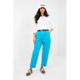 Tieto mrkvové zamatové nohavice sú pohodlnou a štýlovou ponukou na každodenné a kancelárske outfity v uvoľnenom, ležérnom dizajne. Sú vyrobené z kombinácie bavlny s prídavkom elastanu a ponúkajú pohodlie pri nosení, pružnosť a dobré prispôsobenie sa postave. Hladký vzor a priliehavé nohavice s dĺžkou 7/8 dodávajú celému kúsku moderný charakter. Model s vysokým pásom a elastickým pásom vsadeným do pásu zaručuje pohodlie počas celého dňa a je vybavený aj zapínaním na opasok, ktorý zvýrazňuje pás. Bočné vrecká zvyšujú funkčnosť nohavíc. Absencia klasického zapínania zaručuje, že nohavice sa ľahko obliekajú a sú skvelé na každodenné outfity aj pracovné štylizácie.
