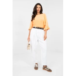 Stylové moleskinové kalhoty ve střihu mrkve jsou skvělým návrhem na každodenní nošení i do práce. Volný charakter v kombinaci s elegantními detaily dělá z modelu skvělý doplněk pro městské outfit. Hladký vzor zdůrazňuje nadčasový charakter kalhot a usnadňuje jejich kombinování s různými kousky šatníku. Model s vysokým pasem krásně podtrhuje pas a gumový pás na pasu zajišťuje pohodlné přizpůsobení se postavě. Další výhodou je zapínací pásek, který dodává celkovému vzhledu stylový závěr. Zužující se nohavice a ozdobné záložky vpředu dávají kalhotám moderní, lehce elegantní charakter a opticky zeštíhlují postavu. Kalhoty jsou vyrobeny z příjemné směsi bavlny s přídavkem elastanu, což zaručuje pohodlí při nošení a volnost pohybů. Postranní kapsy s kapsami zvyšují funkčnost modelu. Jedná se o pohodlný a stylový návrh pro mnoho každodenních příležitostí.