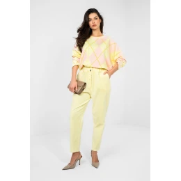 Voľné nohavice s papierovou šnúrou sú pohodlnou a štýlovou ponukou na každý deň. Model s vysokým pásom krásne zvýrazňuje pás, zatiaľ čo elastický pás zaručuje pohodlie pri nosení a ideálne prispôsobenie sa postave. Pohodlie zvyšuje aj prevedenie bez gombíkov, ktoré celému vzhľadu dodáva voľný charakter. Priliehavé nohavice s jemne zúženým strihom opticky zjemňujú nohy, zatiaľ čo vložené bočné vrecká im dodávajú praktickosť. Nohavice sú vyrobené z kombinácie bavlny a elastanu, vďaka čomu sú mäkké, príjemné na dotyk a pružné. Sú skvelou voľbou na každodenné štýlové kombinácie, ktoré sa dokonale hodia k jednoduchému tričku, oversize mikine alebo svetru na mieru.