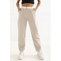 Dámske nohavice z kordury v štýlovom mrkvovom strihu, ideálne na každý deň. Sú vyrobené z kvalitnej bavlnenej zmesi s prídavkom elastanu a zaručujú pohodlie, pružnosť a dobré prispôsobenie sa postave. Model s vysokým pásom a vloženým elastickým pásom zaručuje pohodlie pri nosení a dodatočný zapínací pás zvýrazňuje pás a dodáva mu štýlový vzhľad. 7/8 dlhé zúžené nohavice dodávajú celkovému vzhľadu moderný charakter a opticky predlžujú nohy. Nohavice v hladkom vzore, vybavené praktickými bočnými vreckami, spájajú funkčnosť s minimalistickou estetikou.