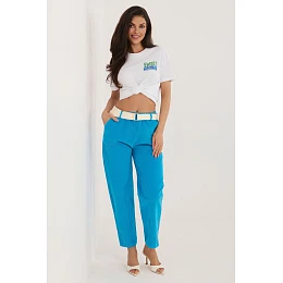 Dámske elastické nohavice v modernom mrkvovom strihu, ideálne na každý deň. Sú vyrobené z kvalitnej bavlnenej zmesi s prídavkom elastanu, poskytujú pohodlie, pružnosť a dobre sedia na postave. Model s vysokým pásom a vloženou gumičkou zaručuje pohodlné nosenie, zatiaľ čo dodatočný zapínací pás zvýrazňuje pás a dodáva štýl. Zúžené nohavice s dĺžkou 7/8 dodávajú celému kúsku moderný charakter a opticky predlžujú nohy. Nohavice v jednofarebnom vzore, vybavené praktickými bočnými vreckami, spájajú funkčnosť s minimalistickou estetikou.