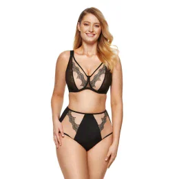 Elegantná mäkká podprsenka krásne zvýrazní ženské krivky. Košíčky pre veľké prsia sú vyrobené z kombinácie výšivky a vystuženého tylu. Dvojdielne košíčky. Nastaviteľné, neodnímateľné ramenné popruhy, široké vo veľkých veľkostiach. Zadný diel z vystuženého elastického tylu. Jemné zdobenie medzi šálkami. Zvislé bočné veľrybie kosti zabraňujúce pokrčeniu bokov.