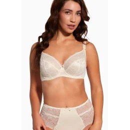 Zvodný čipkový dizajn v krásnej béžovej farbe. Rez so stredne vysokým stredom a trojitým výrezom na košíčku. Dokonale drží a nadvihuje poprsie a dodáva mu prirodzený tvar. Zvýrazňuje výstrih v tvare tulipánu. Horná časť košíčkov je podšitá elastickou sieťovinou. Side Support - bočné vystuženie košíčkov, ktoré dokonale zjednotí a vytvaruje prsia. Podprsenka nemá bočné košíčky s veľrybími kosťami. Nastaviteľné popruhy odolné voči roztiahnutiu a deformácii. Štýlové kovové doplnky striebornej farby neobsahujú nikel.