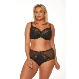 Atraktívna mäkká podprsenka navrhnutá pre ženy s plnšími tvarmi. Tmavomodrý vzor s jemným dizajnom zvýrazňuje eleganciu. Dvojito vystužený bočný panel poskytuje výnimočnú stabilitu a zhromažďuje poprsie do stredu. Spodná časť košíčkov podšitá mäkkou stabilnou sieťovinou dodáva bielizni ľahkosť. Pohyblivá bočná kostica poskytuje prispôsobenie pohybom tela a zvyšuje pohodlie pri nosení. Prsia sú prirodzene zaoblené vďaka použitiu trojitého dizajnu košíčkov. Trojitý háčik vo všetkých veľkostiach je vyrobený z hladkého mikrovlákna.