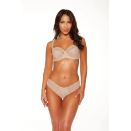 Táto podprsenka s éterickou béžovou výšivkou pôsobí na tele veľmi žensky. Strih s nízkym stredom zbiera prsia dovnútra a jemne ich nadvihuje, čím im dodáva okrúhly tvar. Ideálna pod oblečenie s nízkym strihom. Dvojitá pohyblivá kostica zvyšuje pohodlie pri nosení a prispôsobuje sa telu pri každom pohybe. Nastaviteľné ramienka sú elastické a odolné voči deformácii. Kovové doplnky neobsahujú nikel.