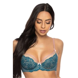 Výrazná, elegantná, mäkká podprsenka Sybilla v tyrkysovej farbe. Košíčky dokonale obopínajú poprsie a sú zdobené tyrkysovou čipkou. Horná časť košíčkov je z jemnej elastickej sieťoviny, okraj je olemovaný mäkkou bavlnenou páskou. Ozdobné mašličky medzi košíčkami a na ramienkach. Zadná časť z dvojitej elastickej sieťoviny. Nastaviteľné ramienka bez ramienok. Dvojradové alebo trojradové zapínanie (v závislosti od veľkosti) s trojstupňovým nastavením.
