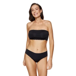 Mäkká, hladká podprsenka bez ramienok ideálne zvýrazňuje ramená. Jemne vystužené, vyberateľné vložky z penového korzetového materiálu umiestnené vo vreckách na vnútornej strane košíčkov. Vnútorný silikónový pásik prebiehajúci po obvode, ktorý udržiava podprsenku na mieste. Minimálne švy zaisťujú pohodlie a decentný vzhľad. Žiadne škrabľavé štítky. Ozdobná úprava okrajov. Vhodná ako podprsenka alebo na samostatné nosenie ako top.