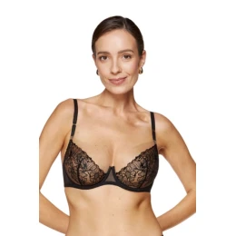 Zoznámte sa s elegantnou a ženskou mäkkou podprsenkou Fleur. Košíčky sú vyrobené z lesklej pletenej bielizne a vrchnej časti z priehľadného tylu. Košíčky sú vyrobené z elegantnej lesklej pletenej bielizne a vrchnej časti z priehľadného tylu, jemného, čiastočne priehľadného. Ramienka majú zlaté ozdoby s nastaviteľnou výškou. Zvislé bočné kostice stabilizujú obvod podprsenky. Zadná časť je vyrobená z elastického tylu. Podprsenka bola navrhnutá a ušitá v Poľsku.