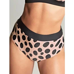 Spodný diel dámskych plaviek značky Panache. Nohavičky majú vysoký pás, čierny pás a béžové nohavičky s čiernymi bodkami. Po celej podlahe.