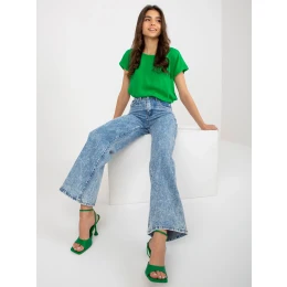 Modré džínsy so širokými nohavicami a vysokou sedmičkou.