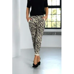 Dámske vzorované tepláky s módnym zvieracím motívom, dĺžka nohavíc 7/8, dve šikmé vrecká na prednej strane a hladká zadná strana,ideálne k mnohým športovým a ležérnym outfitom, široký a elastický pás, skladané manžety na nohaviciach a šikmé bočné vrecká, vyrobené z bavlnených teplákov od poľského výrobcu.